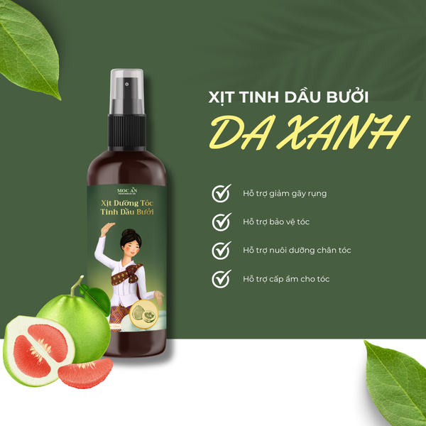 Trong số những sản phẩm dưỡng tóc tự nhiên hiện nay, Xịt Tinh Dầu Vỏ Bưởi Mộc Ân Haircare nổi bật nhờ được chiết xuất hoàn toàn từ bưởi da xanh tươi nguyên – loại bưởi đặc trưng của vùng nhiệt đới Việt Nam.