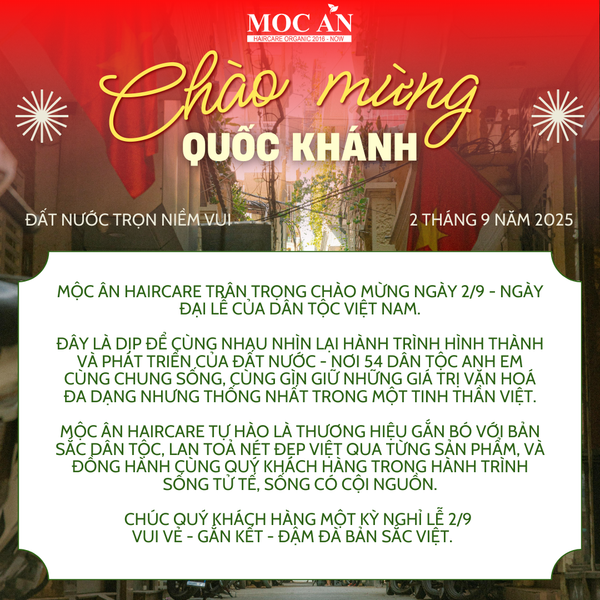 Mộc Ân Haircare xin trân trọng gửi lời chúc mừng đến Quý khách hàng nhân dịp Quốc khánh 2/9 – ngày hội lớn của toàn dân tộc Việt Nam.
